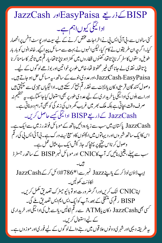 The Benazir Income Support Programme (BISP) is one of the main welfare packages in Pakistan. It helps masses of poor families by providing financial support to meet basic needs. In 2025, BISP has presented a new technique to make payments easier: recipients can now obtain their money through JazzCash, EasyPaisa, and other digital folders. This change has abridged long to come periods and made the course more secure. Families no lengthier need to travel far to gather cash. With digital folders, the money energies directly into their mobile account, which can be withdrawn or spent anytime.