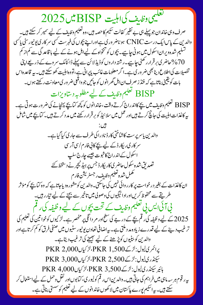 In this article, we are sharing all the details about BISP Taleemi Wazaif 2025, including eligibility, required documents, stipend amounts, payment updates, and benefits. This ingenuity is more than financial aid; it is a alleyway toward a sunnier and more educated Pakistan.