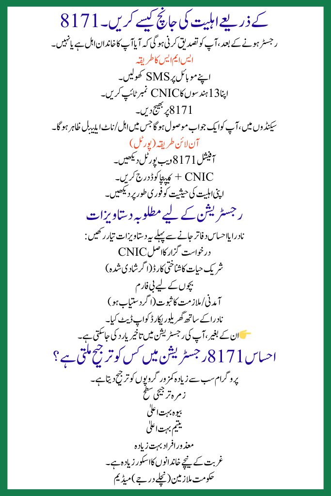 The Ehsaas 8171 Program Registration 8171 NADRA is Pakistan’s largest social welfare scheme. It is particularly intended for: